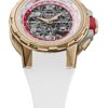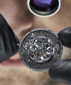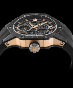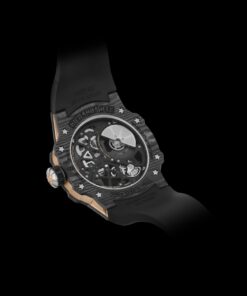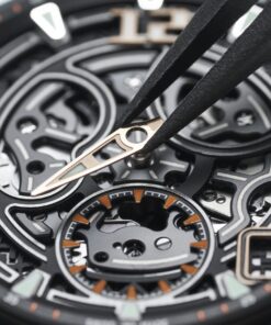 The RM 33-03 Automatic is Richard Mille’s rare foray into the round watch, but it’s anything but traditional. Offered in grade 5 titanium or Carbon TPT® with a 5N red gold caseband, it builds on the RM 33-02, fusing the sporty tonneau aesthetic with the purity of a circular case. Inside is the wafer-thin RMXP3 calibre, a skeletonised automatic movement just 3.28 mm thick. A platinum micro rotor mounted on ceramic bearings winds bi-directionally, while a titanium baseplate treated with Titalyt® and black PVD-coated bridges keep the ultra-thin construction rigid and precise. The dial feels almost architectural, with a semi-instantaneous date at 5 o’clock and a rare small seconds display at 6. A variable-inertia balance beats at 3Hz, regulated by four tiny weights to fine-tune its oscillation, driving a 40-hour power reserve. True to Richard Mille, finishing is exceptional, sandblasting, satin-finishing, and beveling create a play of light and shadow through the openworked structure. The 18K 5N red gold numerals appear to float on titanium rails, adding depth without distracting from the technicality beneath. Despite its complexity, the RM 33-03 wears effortlessly. Measuring 41.7 mm across and just 9.7 mm thick, it’s featherlight thanks to its advanced materials but feels reassuringly solid. The tripartite case, with polished and satin finishes, is secured by the brand’s signature titanium spline screws, while the strap flows naturally from the case and closes with a titanium folding buckle. Whether in full titanium or Carbon TPT® with gold accents, it’s a pure distillation of Richard Mille’s philosophy: cutting-edge materials, uncompromising engineering, and unmistakable design.