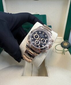 This Oyster Perpetual Cosmograph Daytona in 18 ct Everose gold, with a black, diamond-set dial and an Oyster bracelet, features an 18 ct Everose gold bezel with engraved tachymetric scale. This chronograph was designed to be the ultimate timing tool for endurance racing drivers. More than 50 years after its creation, the Cosmograph Daytona remains in a class of its own among sport chronographs and continues to transcend time. This model features a black, diamond-set dial with snailed counters, 18 ct gold applique hour markers and hands with a Chromalight display, a highly-legible luminescent material. The central sweep seconds hand allows an accurate reading of 1/8 second, while the two counters on the dial display the lapsed time in hours and minutes. Drivers can accurately map out their track times and tactics without fail.