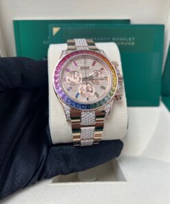 40mm 18K Everose case, screw-down steel back, end pieces set with diamonds, screw-down crown and push buttons with Triplock triple waterproofness, fixed 18K yellow gold bezel set with 36 baguette-cut sapphires in rainbow graduation, scratch-resistant sapphire crystal, diamond paved dial, 11 baguette-cut rainbow colored sapphire hour markers, Rolex calibre 4130 self-winding movement with chronograph central , 30-minute counter at 3 o’clock, and 12-hour counter at 9 o’clock, approximately 72 hours of power reserve, 18K Everose gold Oyster bracelet with flat three-piece links, center links set with diamonds, folding Oysterlock buckle with Easylink 5mm comfort extension link. Waterproof to 100 meters