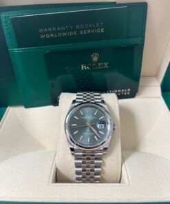 36mm Oystersteel case, screw-down back, screw-down crown with twinlock double waterproofness system, domed bezel, scratch-resistant sapphire crystal with cyclops lens over the date, mint green dial, index hour markers, Rolex calibre 3235 perpetual self-winding movement with centre hour, minute and seconds hands, instantaneous date with rapid setting, and stop-seconds for precise time setting, approximately 70 hours of power reserve, Jubilee bracelet with five-piece links, folding Oysterclasp buckle