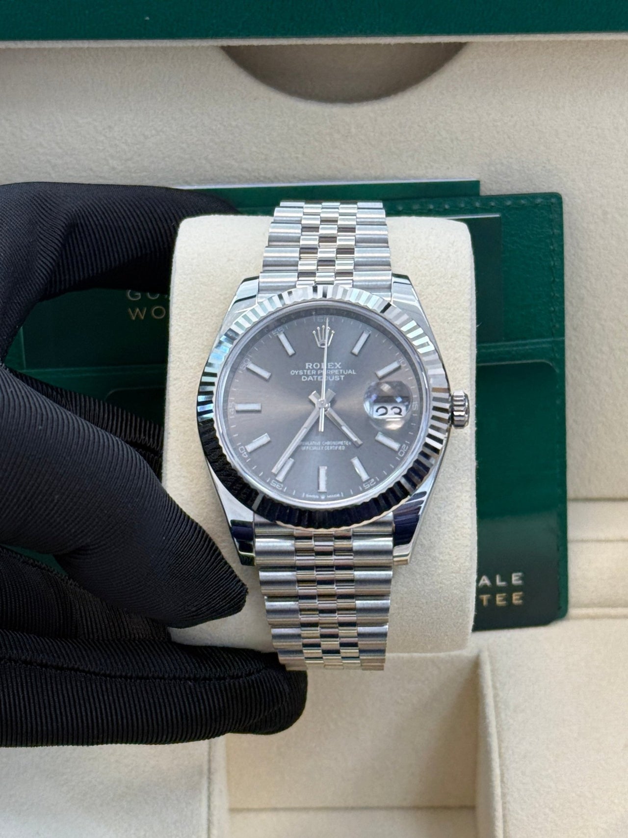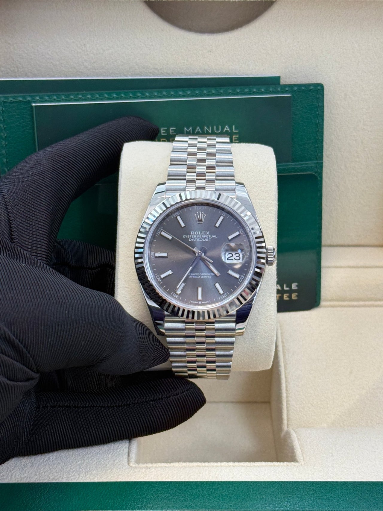 Datejust 41 White Gold & Steel Fluted Bezel Dark Rhodium Index Dial 41mm white Rolesor case comprised of a 904L steel monobloc middle case, screw-down steel back, screw-down crown with twin lock double waterproofness system, 18K white gold fluted bezel, scratch-resistant double anti-reflective sapphire crystal with cyclops lens over the date, dark rhodium dial, index hour markers. Rolex calibre 3235 perpetual self-winding movement with date at 3 o’clock that changes instantaneously at midnight in a few thousandths of a second, approximately 70 hours of power reserve, 904L steel Jubilee bracelet with five-piece links, folding Oysterclasp buckle with Easylink 5mm comfort extension link. Waterproof up to 100 meters.