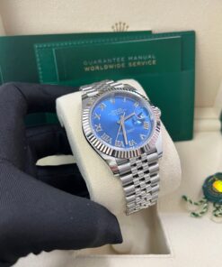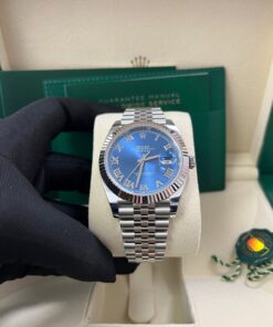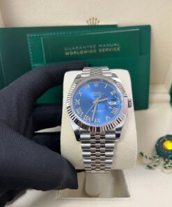 The Rolex Datejust 41 Blue Roman Dial (Reference 126334) is the classic Rolex DateJust, now available in this larger 41mm case size. Crafted with White Rolesor, a harmonious combination of 904L Oystersteel and 18K white gold, this watch exudes sophistication for any occasion while also being wearable as a daily watch. The 41mm case houses a captivating blue dial adorned with Roman numeral hour markers, embodying classic charm. The signature fluted bezel in 18K white gold enhances its iconic design, while the scratch-resistant sapphire crystal with a Cyclops lens over the date ensures optimal readability. Powered by the Rolex Calibre 3235 self-winding movement, the Datejust delivers unparalleled precision and reliability, with an impressive 70-hour power reserve. The Jubilee bracelet, featuring five-piece links in Oystersteel, offers superior comfort and style, secured by the Oysterclasp buckle with Easylink extension for added convenience. Water-resistant up to 100 meters, the Datejust 41 is designed for both everyday wear and formal occasions. Its bold yet refined aesthetic makes it an essential addition to any watch collection.