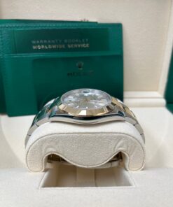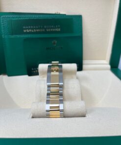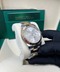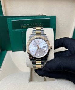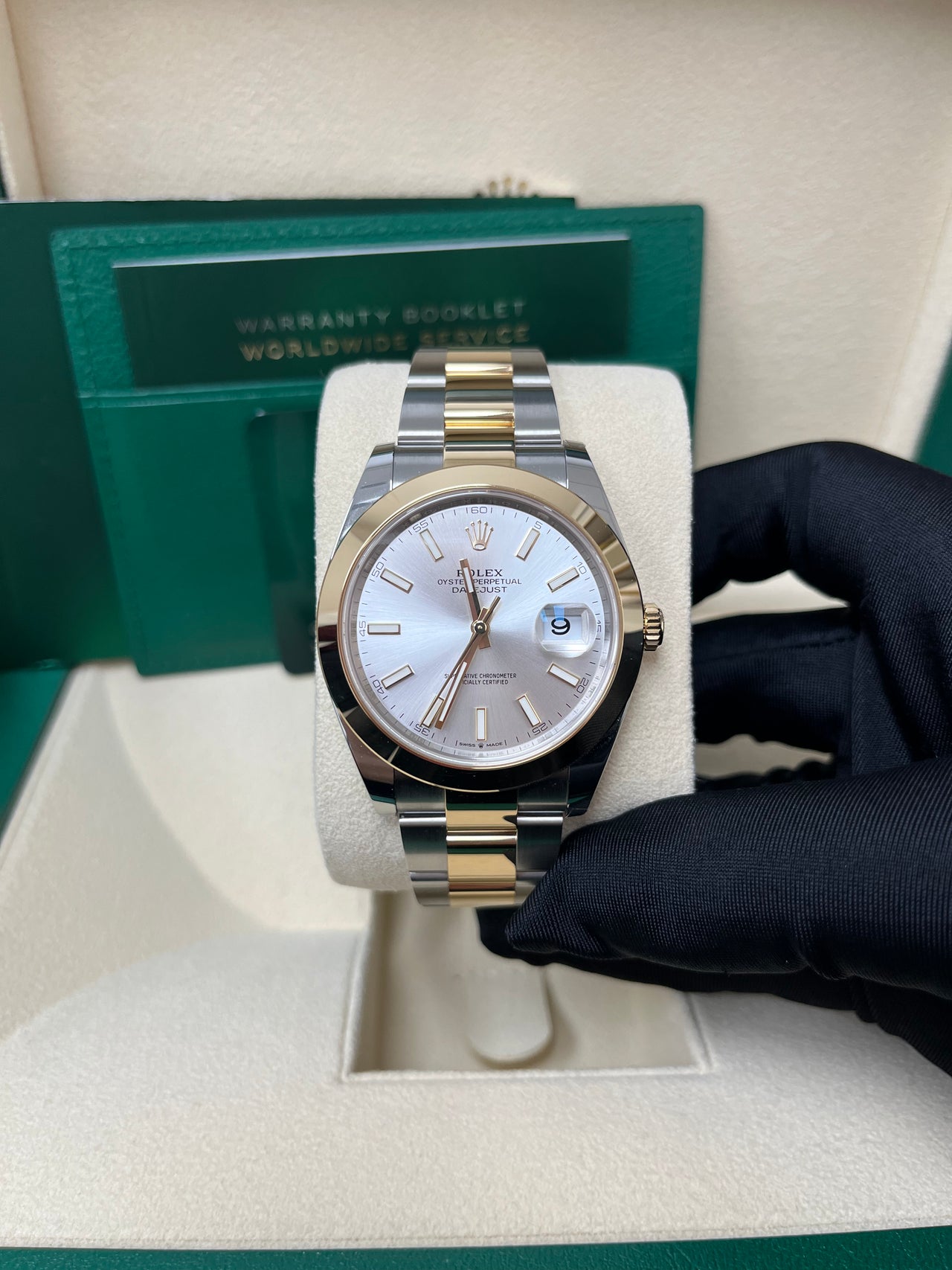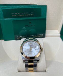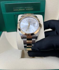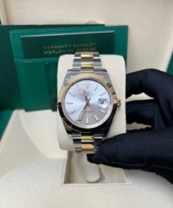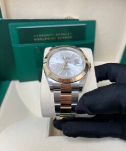 41mm Yellow Rolesor case with 904L steel monobloc middle case, screw-down steel back, 18K yellow gold screw-down crown, 18K yellow gold smooth bezel, scratch-resistant double anti-reflective sapphire crystal with cyclops lens over the date, silver dial, index hour markers, Rolex calibre 3235 perpetual self-winding movement with date at 3 o’clock that changes instantaneously at midnight in a few thousandths of a second, approximately 70 hours of power reserve, yellow Rolesor Oyster bracelet made from a combination of 904L steel and 18K yellow gold with flat three-piece links, folding Oysterclasp buckle with Easylink 5mm comfort extension link. Waterproof to 100 meters.