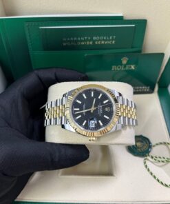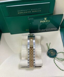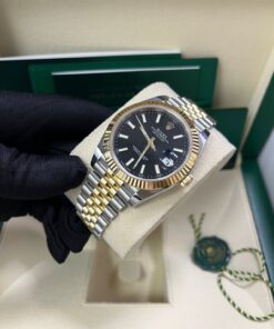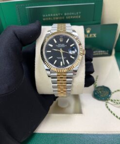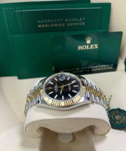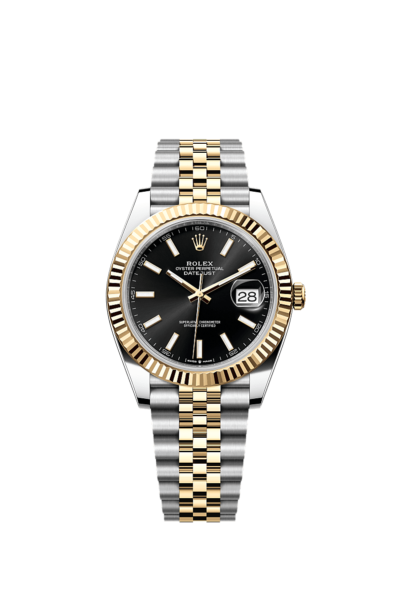41mm Yellow Rolesor case with 904L steel monobloc middle case, screw-down steel back, 18K yellow gold screw-down crown, 18K yellow gold fluted bezel, scratch-resistant double anti-reflective sapphire crystal with cyclops lens over the date, black dial, index hour markers, Rolex calibre 3235 perpetual self-winding movement with date at 3 o’clock that changes instantaneously at midnight in a few thousandths of a second, approximately 70 hours of power reserve, yellow Rolesor Jubilee bracelet made from a combination of 904L steel and 18K yellow gold with five-piece links, folding Oysterclasp buckle with Easylink 5mm comfort extension link. Waterproof to 100 meters.