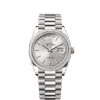 The Oyster Perpetual Day-Date 36 in platinum with a white dial, diamond-set bezel and a President bracelet.