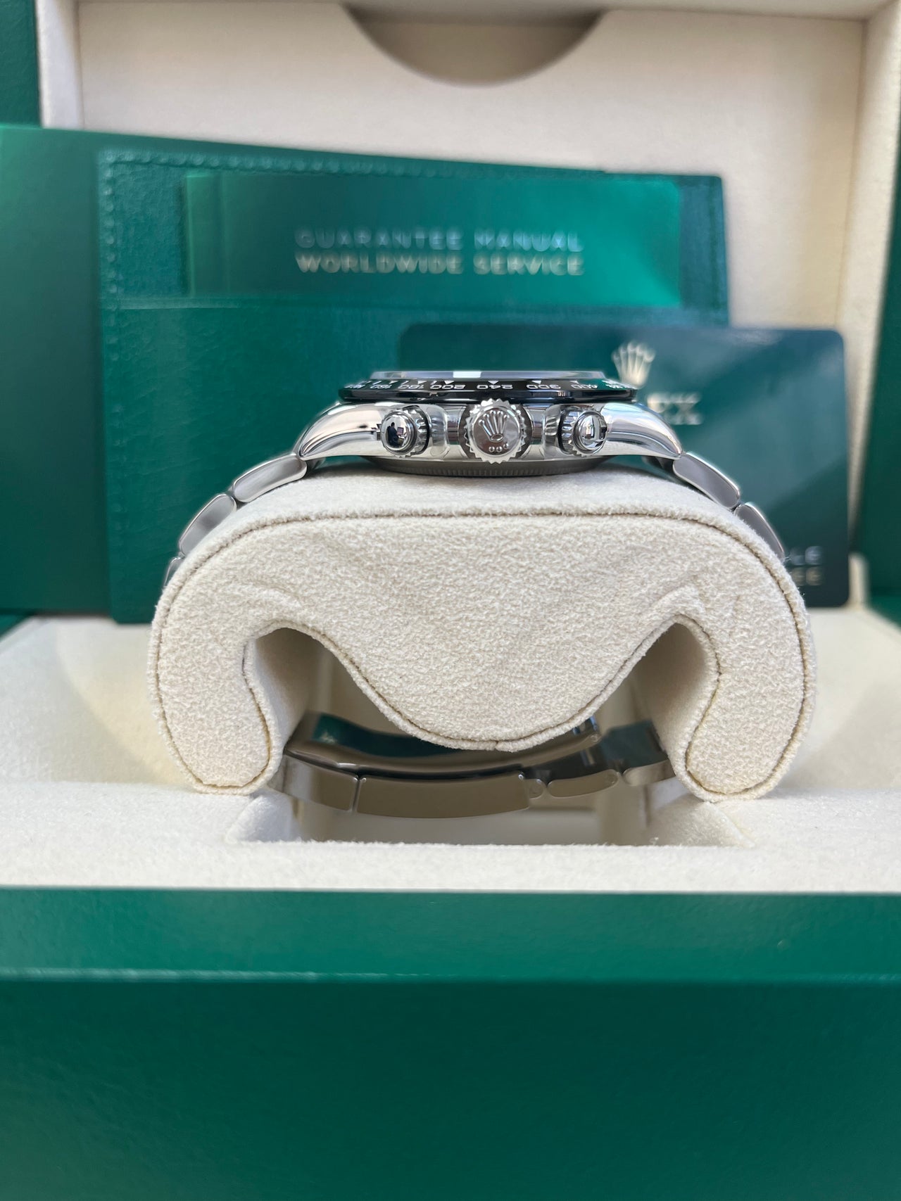 40mm polished 904L stainless steel case, screw-down back and push buttons, screw-down crown and push buttons with Triplock triple waterproofness, black monobloc ceramic Cerachrom bezel with engraved tachymetric scale, scratch-resistant sapphire crystal, black lacquer dial, 18K white gold applied applique hour markers with Chromalight, grey snailed counters, automatic movement with chronograph central , 30-minute counter at 3 o’clock, and 12-hour counter at 9 o’clock, approximately 72 hours of power reserve, 904L stainless steel Oyster bracelet with solid links, folding Oysterlock buckle with Easylink 5mm comfort extension link. Waterproof to 100 meters. Prices of Rolex Daytona Watch continue to rise due to very limited production levels. Introduced at Baselworld 2016 Website. 2020.