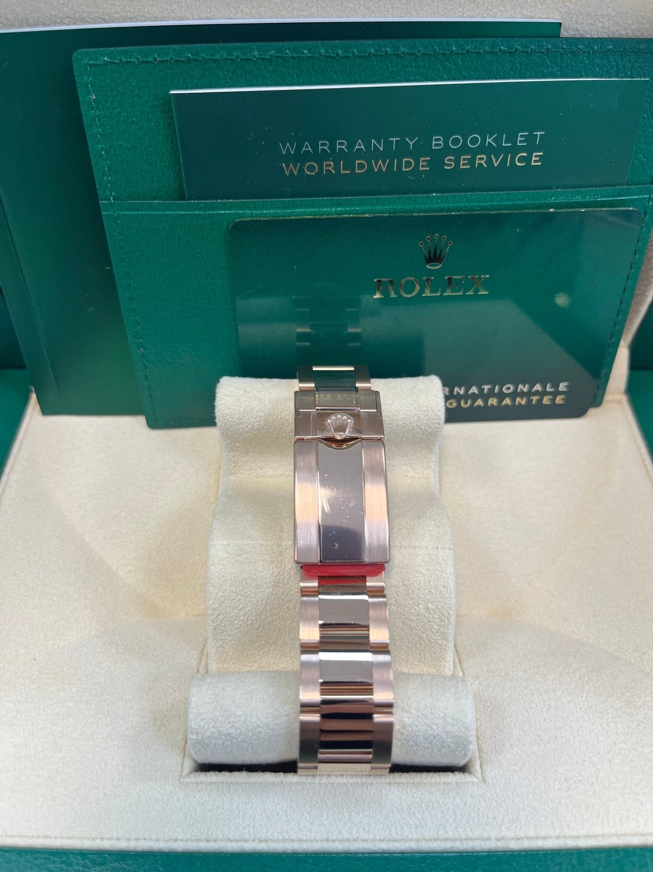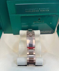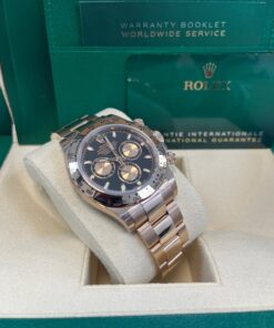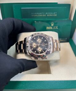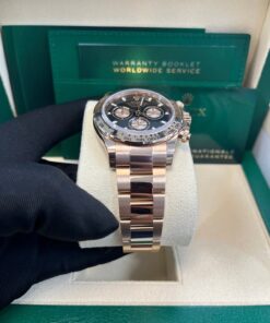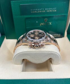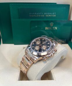 40mm 18K Everose gold case, tachymeter engraved bezel, screw-down push buttons, black dial with Everrose subdials, and Oysterlock bracelet with Easylink. 2020.
