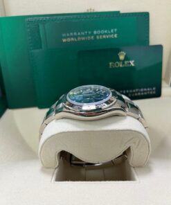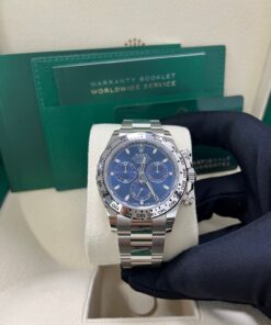 The Rolex Daytona 116509 is a striking combination of elegance and performance, featuring a 40mm 18K white gold case and a rich blue sunburst dial. Designed for precision, its calibre 4130 movement powers a chronograph function with a central seconds hand, 30-minute counter, and 12-hour counter for superior timekeeping. The fixed white gold tachymeter bezel reinforces its motorsport heritage, while the Oyster bracelet with an Oysterlock clasp ensures a comfortable and secure fit. This is a timeless collector’s piece that blends luxury with Rolex’s renowned engineering, and is always in demand.