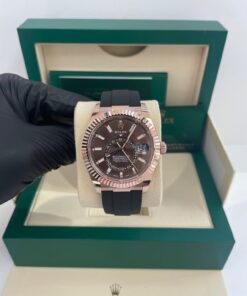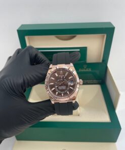 42mm 18K Everose gold case, screw-down back, screw-down crown with twinlock double waterproofness system, fluted bezel, scratch-resistant sapphire crystal with cyclops lens over the date, chocolate dial, index hour markers, Rolex calibre 9001 automatic movement with 24-hour display on off-centre disc, second time zone, instantaneous annual calendar at 3 o’clock and rapid-setting of the date, month display via 12 apertures around the circumference of the dial, stop-seconds for precise time setting, approximately 72 hours of power reserve, Oysterflex bracelet made from flexible metal blades overmoulded with high-performance elastomer, folding Oysterclasp buckle with glidelock extension system. Waterproof to 100 meters. 2020.