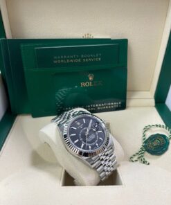 42mm white Rolesor case comprised of Oystersteel and white gold, screw-down back, screw-down crown with twinlock double waterproofness system, fluted, bidirectional rotatable rolex ring command bezel, scratch-resistant sapphire crystal with cyclops lens over the date, bright black dial, index hour markers, 9002, manufacture Rolex perpetual self-winding, dual time zones, annual calendar movement with centre hour, minute and seconds hands, 24-hour display on off-centre disc, second time zone, instantaneous annual calendar at 3 o’clock and rapid-setting of the date, month display via 12 apertures around the circumference of the dial, and stop-seconds for precise time setting, approximately 72 hours of power reserve, Jubilee bracelet with five-piece links, folding Oysterclasp buckle with Easylink 5mm comfort extension link. Waterproof to 100 metres / 330 feet.