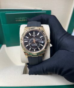 42mm 18K yellow gold case, screw-down back, screw-down crown with twinlock double waterproofness system, fluted bezel, scratch-resistant sapphire crystal with cyclops lens over the date, bright black dial, index hour markers, Rolex calibre 9001 automatic movement with 24-hour display on off-centre disc, second time zone, instantaneous annual calendar at 3 o’clock and rapid-setting of the date, month display via 12 apertures around the circumference of the dial, stop-seconds for precise time setting, approximately 72 hours of power reserve, Oysterflex bracelet made from flexible metal blades overmoulded with high-performance elastomer, folding Oysterclasp buckle with glidelock extension system. Waterproof to 100 meters. 2020.