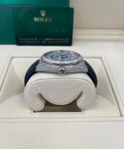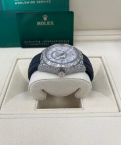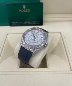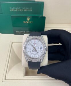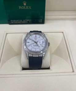 CASE & BEZEL Case Material: White Gold Case Size: 42MM Bezel: White Gold DIAL Dial Color: Meteorite Dial Material: No Markers BRACELET Bracelet Material: Rubber Closure: Fold Over Clasp Closure Material: White Gold FEATURES Water Resistance: 100 meters / 330 feet Movement: Automatic