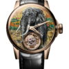 The Savanna Tourbillon Cobra features a first-of-its-kind micro-painting on a jigsaw puzzle dial in fine-arts watchmaking. This dial is a meticulous puzzle with detailed artwork of a cobra crafted by a skilled artist. Each Savanna Tourbillon Cobra watch showcases exceptional craftsmanship, with the puzzle constructed on four levels consisting of eighty-one interlocking pieces. The artist disassembles the puzzle to paint each piece’s edges with precision and then reassembles it to form the dial. This dial exemplifies the blend of métiers d’art craftsmanship and artistry, with the cobra captivating viewers worldwide. The Savanna Tourbillon Cobra features an off-center flying tourbillon at 6 o’clock that compensates for gravity’s effects. It is powered by a hand-wound mechanism with twin barrels that provide a 96-hour power reserve. The watch is encased in an 18-carat 5N pink-gold, 40-millimeter case complemented by a domed sapphire crystal that displays the intricate puzzle and tourbillon details. The design is completed with open-worked horns that seamlessly integrate with the black alligator strap.