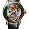 The Savanna Tourbillon Panda features a first-of-its-kind micro-painting on a jigsaw puzzle dial in fine-arts watchmaking. This dial is a meticulous puzzle with detailed artwork of a serene panda, crafted by a skilled artist. Each Savanna Tourbillon Panda watch showcases exceptional craftsmanship, with the puzzle constructed on four levels consisting of eighty-one interlocking pieces. The artist disassembles the puzzle to paint each piece’s edges with precision and then reassembles it to form the dial. This dial exemplifies the blend of métiers d’art craftsmanship and artistry, with the panda captivating viewers worldwide. The Savanna Tourbillon Panda features an off-center flying tourbillon at 6 o’clock that compensates for gravity’s effects. It is powered by a hand-wound mechanism with twin barrels that provide a 96-hour power reserve. The watch is encased in an 18-carat 5N pink-gold, 40-millimeter case complemented by a domed sapphire crystal that displays the intricate puzzle and tourbillon details. The design is completed with open-worked horns that seamlessly integrate with the black alligator strap.