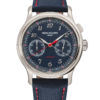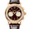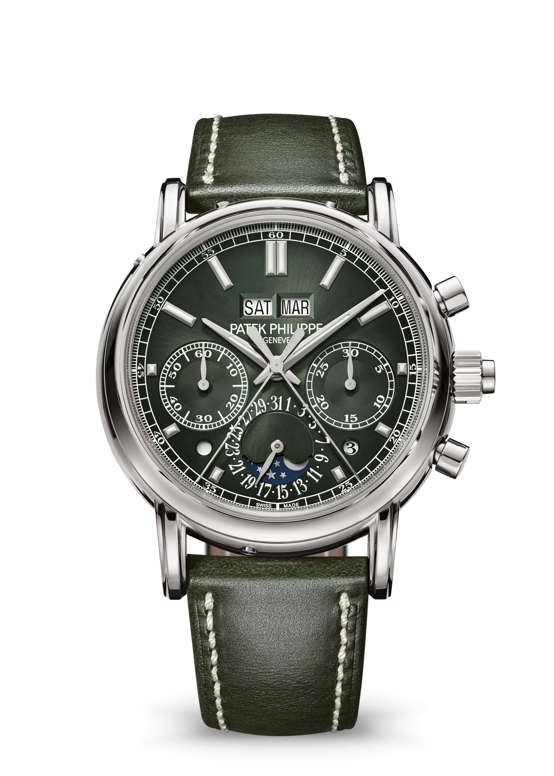 Patek Philippe has revisited one of its great classics with a white gold case and an olive green sunburst dial with black-gradient rim – a modern yet timeless color scheme. This split-seconds perpetual calendar chronograph houses a manually wound movement combining traditional construction with seven patented innovations.