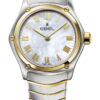 Women’s EBEL Sport Classic watch, stainless steel and 18K yellow gold case with 53 diamonds (0.1643ct), Ø 24mm, beige mother-of-pearl dial with applied Roman numerals and 8 diamonds (0.031ct), sapphire crystal with antireflective treatment underneath, two-tone stainless steel wave link bracelet with a folding clasp, Swiss quartz movement, water-resistant up to 5 bar