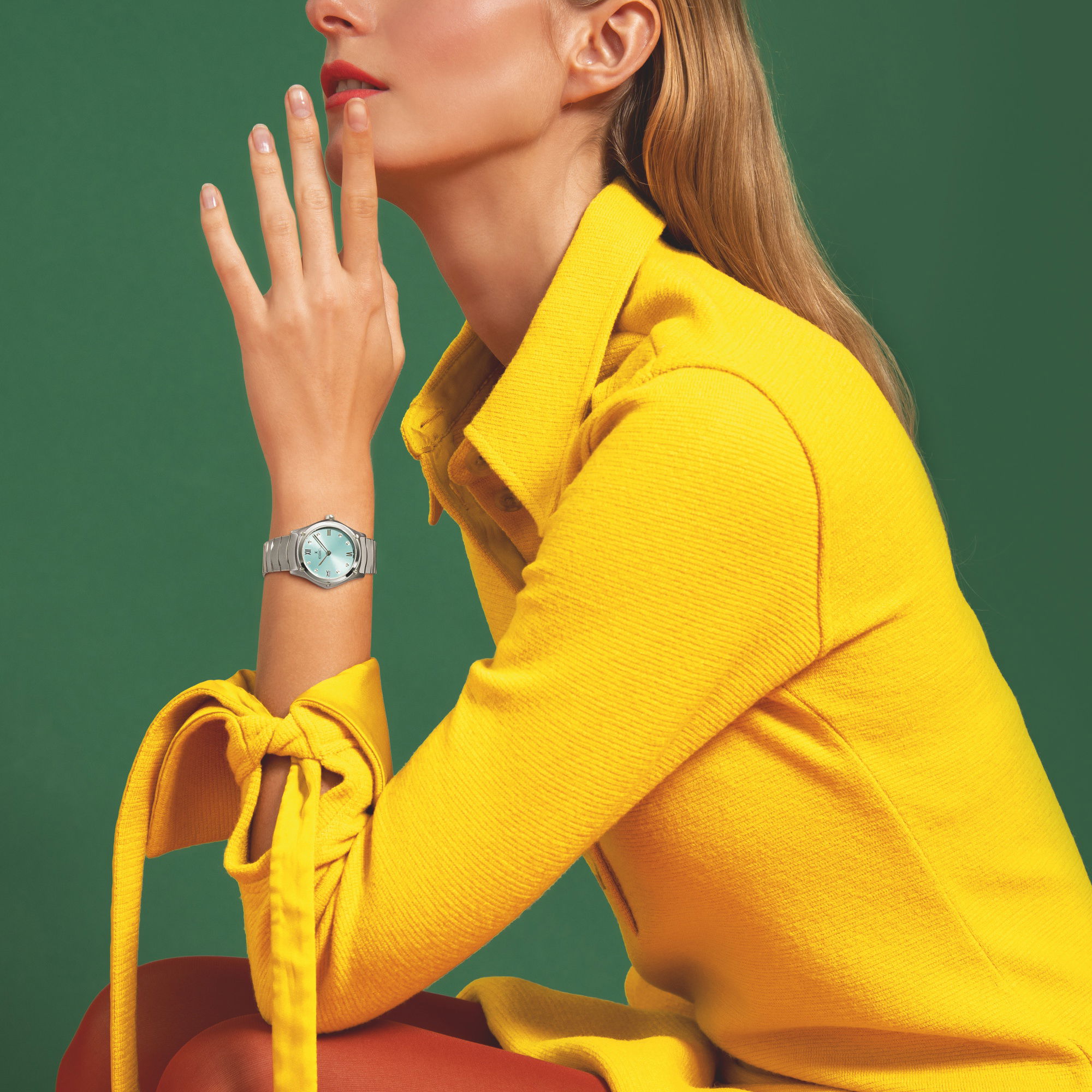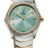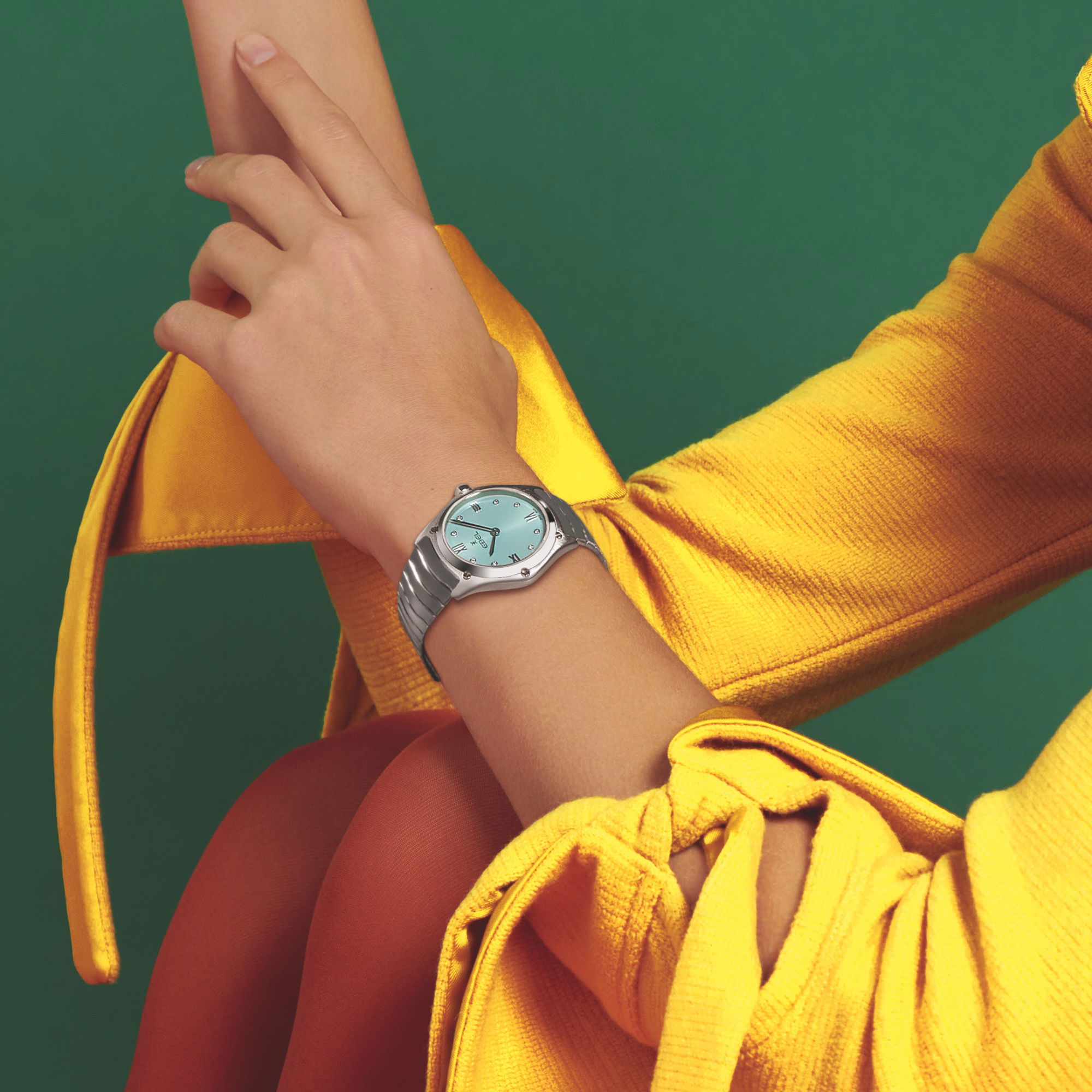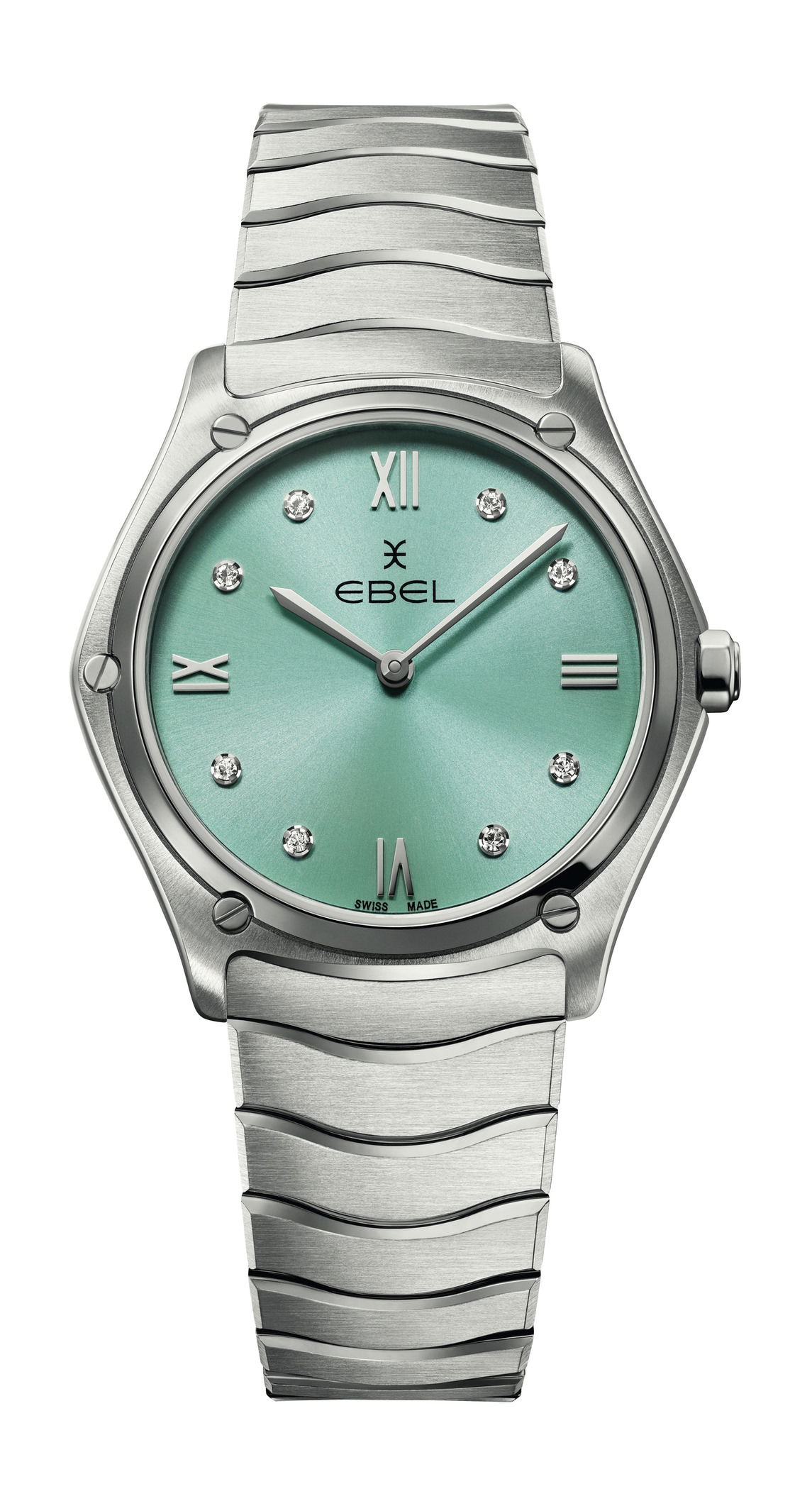 Women’s EBEL Sport Classic watch, stainless steel case, Ø 33mm, mint blue galvanic dial with applied Roman numerals and 8 diamonds (0.052ct), sapphire crystal with antireflective treatment underneath, stainless steel wave link bracelet with a folding clasp, Swiss quartz movement, water-resistant up to 5 bar