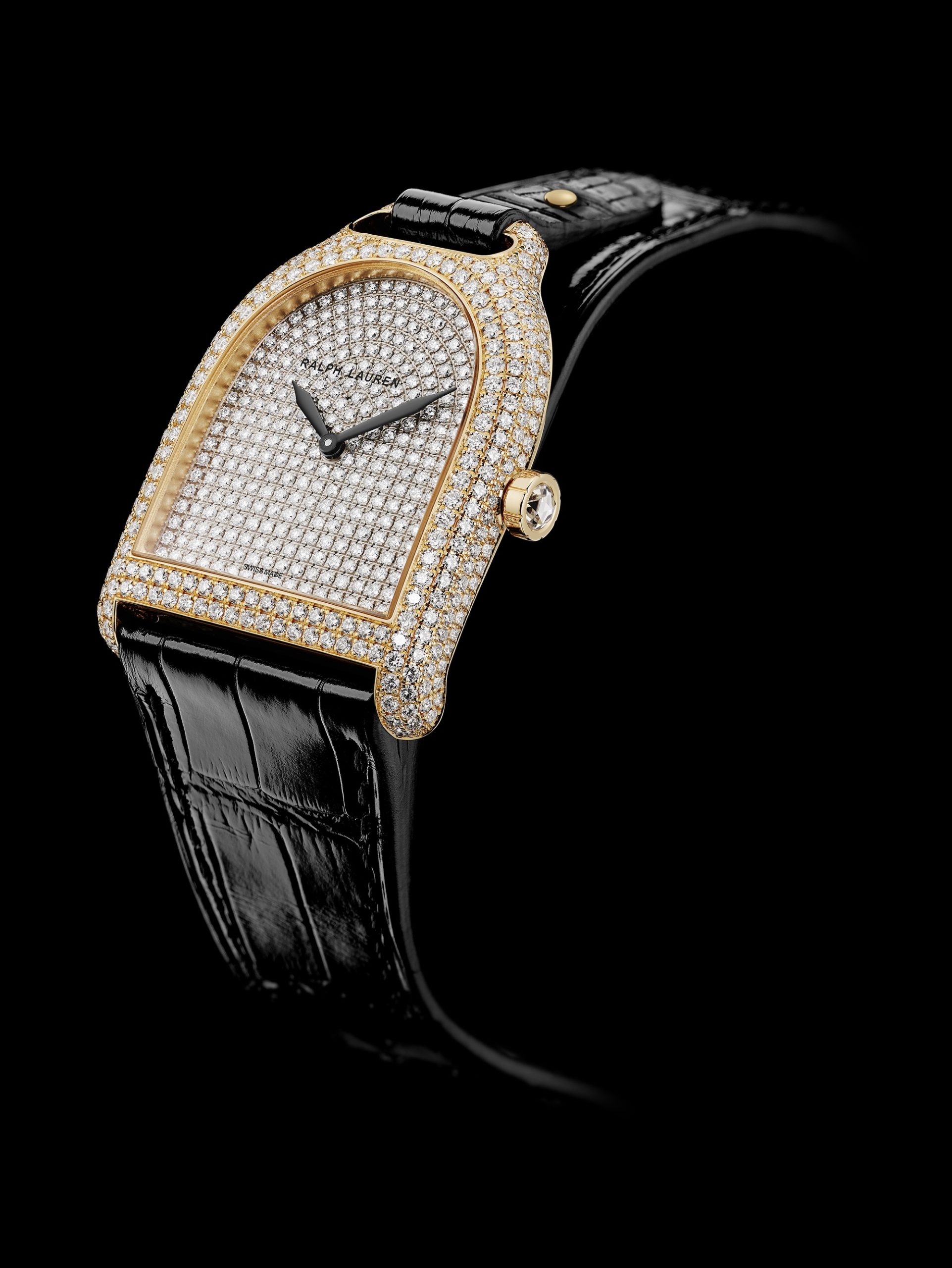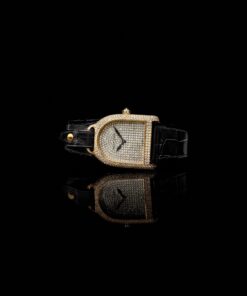 The Stirrup Rose Gold Full Set Diamonds by Ralph Lauren is a luxurious and feminine addition to the Stirrup Watch collection. It features a dial set with 307 brilliant-cut diamonds (1.46 carats) in 18K white gold, creating a sparkling display. The 18K rose gold watch case, adorned with 282 brilliant-cut diamonds (1.77 carats), enhances the dial’s opulence. A black alligator strap adds a touch of discreet elegance. Powered by a six-jewel Swiss Manufacture movement caliber 976.001, it boasts a 74-month battery life. This watch exemplifies Ralph Lauren’s dedication to master craftsmanship, innovation, and timeless luxury, celebrating 15 years of the Stirrup collection’s equestrian-inspired elegance.