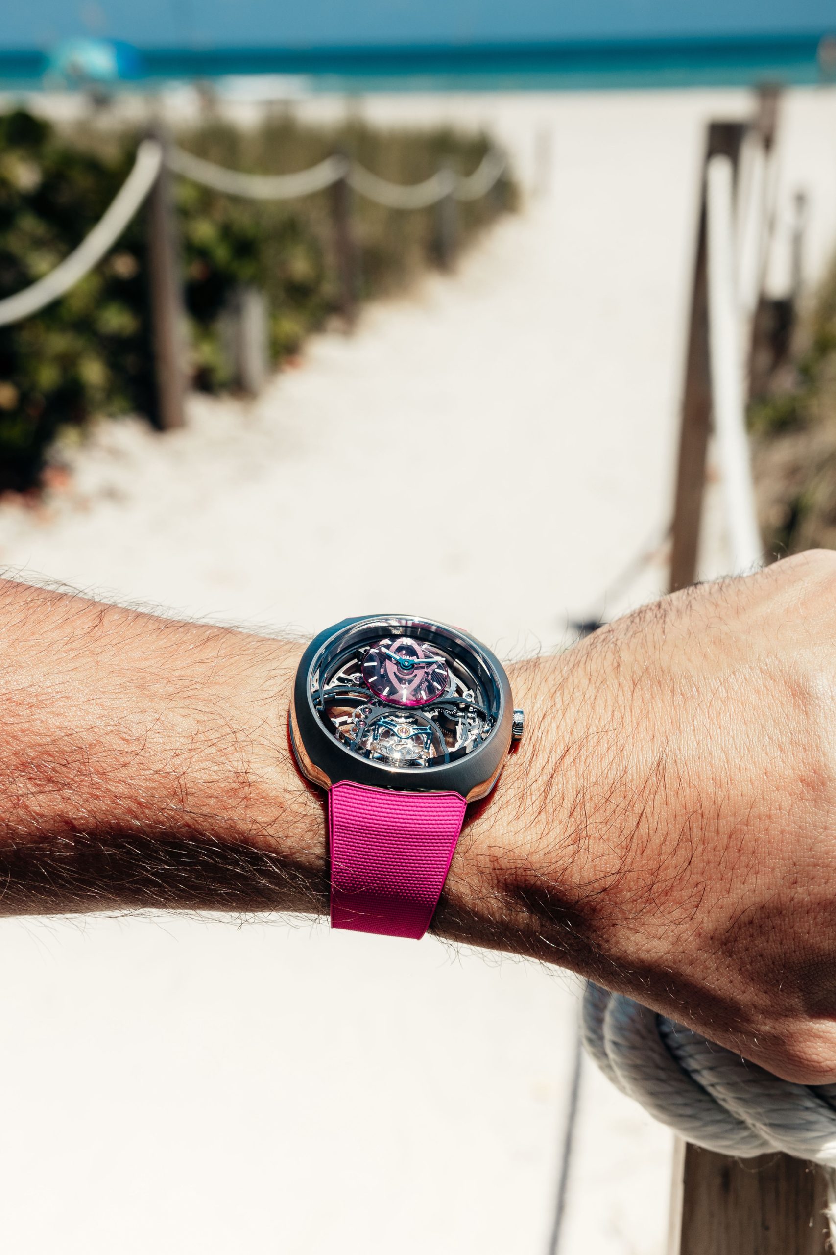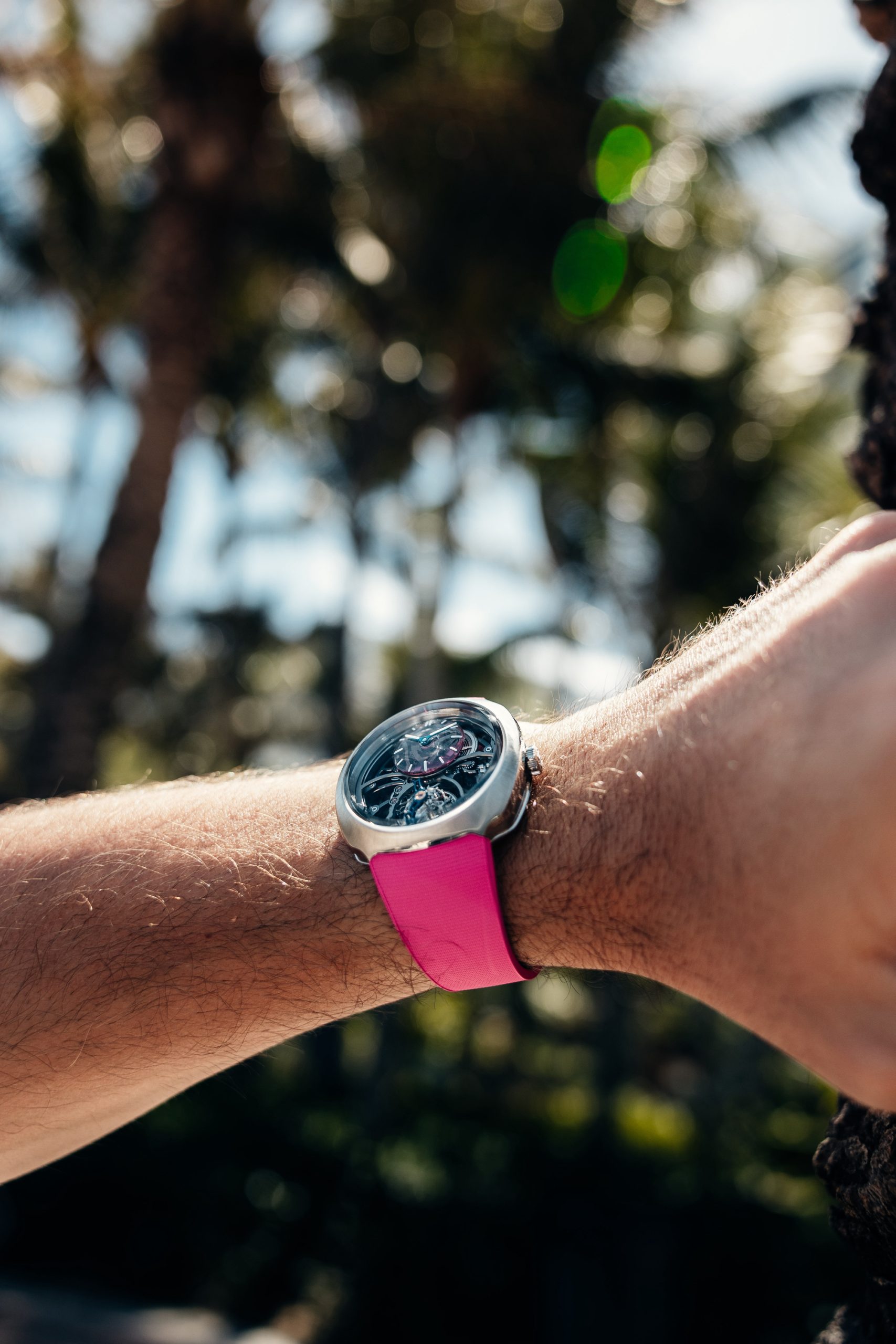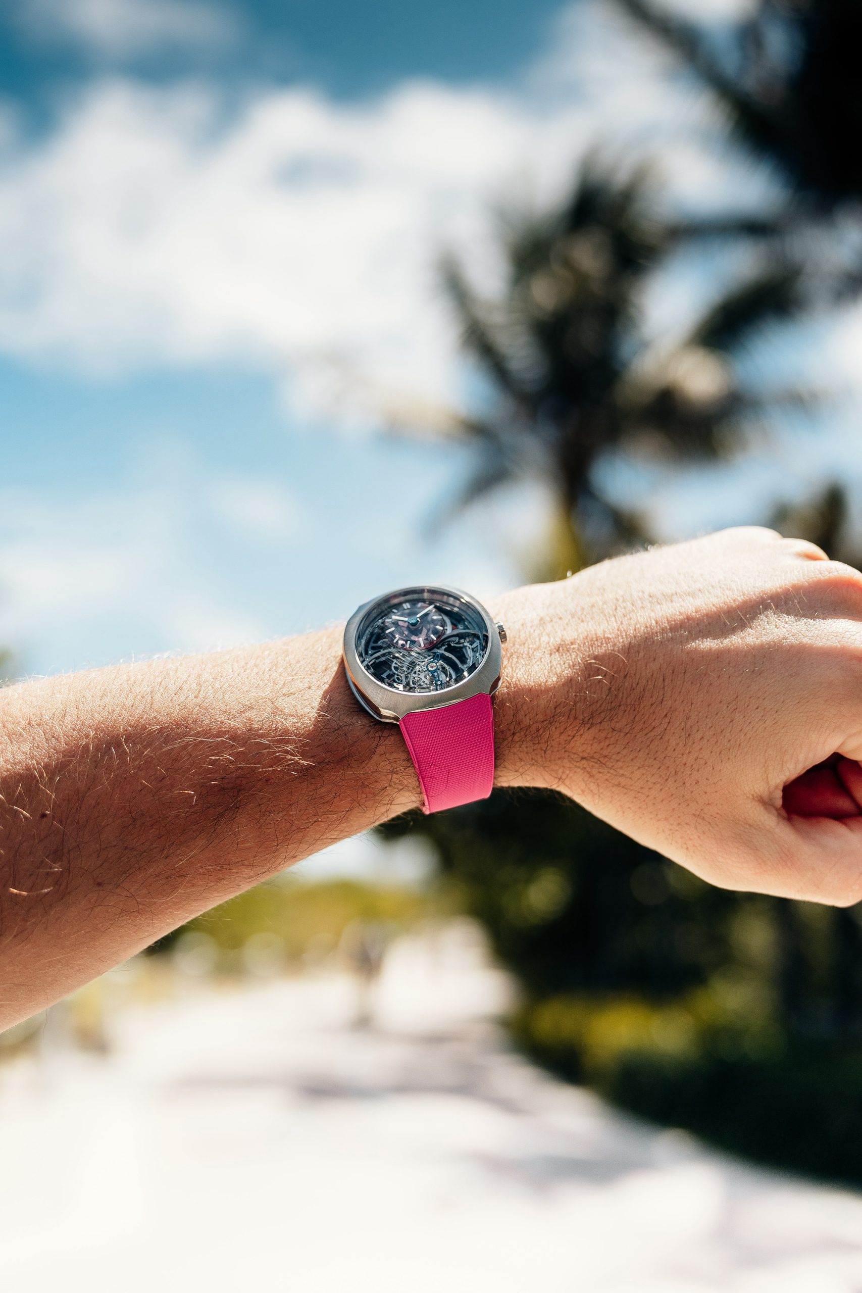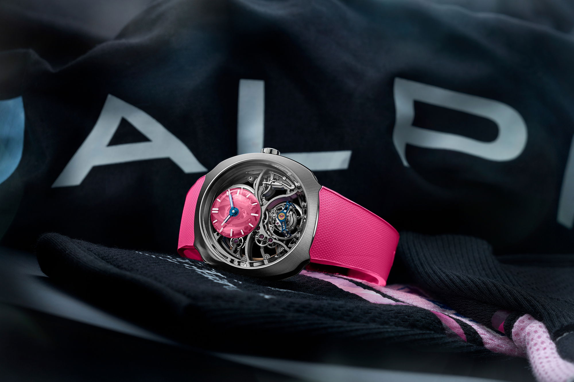 H. Moser & Cie. recently launched a pink version of its Streamliner Cylindrical Tourbillon Skeleton Alpine Limited Edition, the Pink Livery model to coincide with the 2024 Miami Grand Prix. This edition pays tribute to the second livery of the BWT Alpine F1 Team, featuring their iconic pink color. Limited to just 20 pieces and exclusively available online, this timepiece showcases a skeletonized dial with a small pink domed dial at 12 o’clock, made of synthetic corundum. The watch features Super-Luminova® indices and Globolight® inserts for night legibility, paired with a pink molded rubber strap. The automatic calibre HMC 811, fully skeletonized, powers the watch, featuring a one-minute flying tourbillon and a cylindrical balance-spring crafted by hand, showcasing traditional expertise alongside modern design. With water resistance up to 12 ATM, the watch is both stylish and functional. Additionally, one more piece will be auctioned for charity, with proceeds supporting AQUA PEARLS, a foundation dedicated to improving access to clean drinking water worldwide.