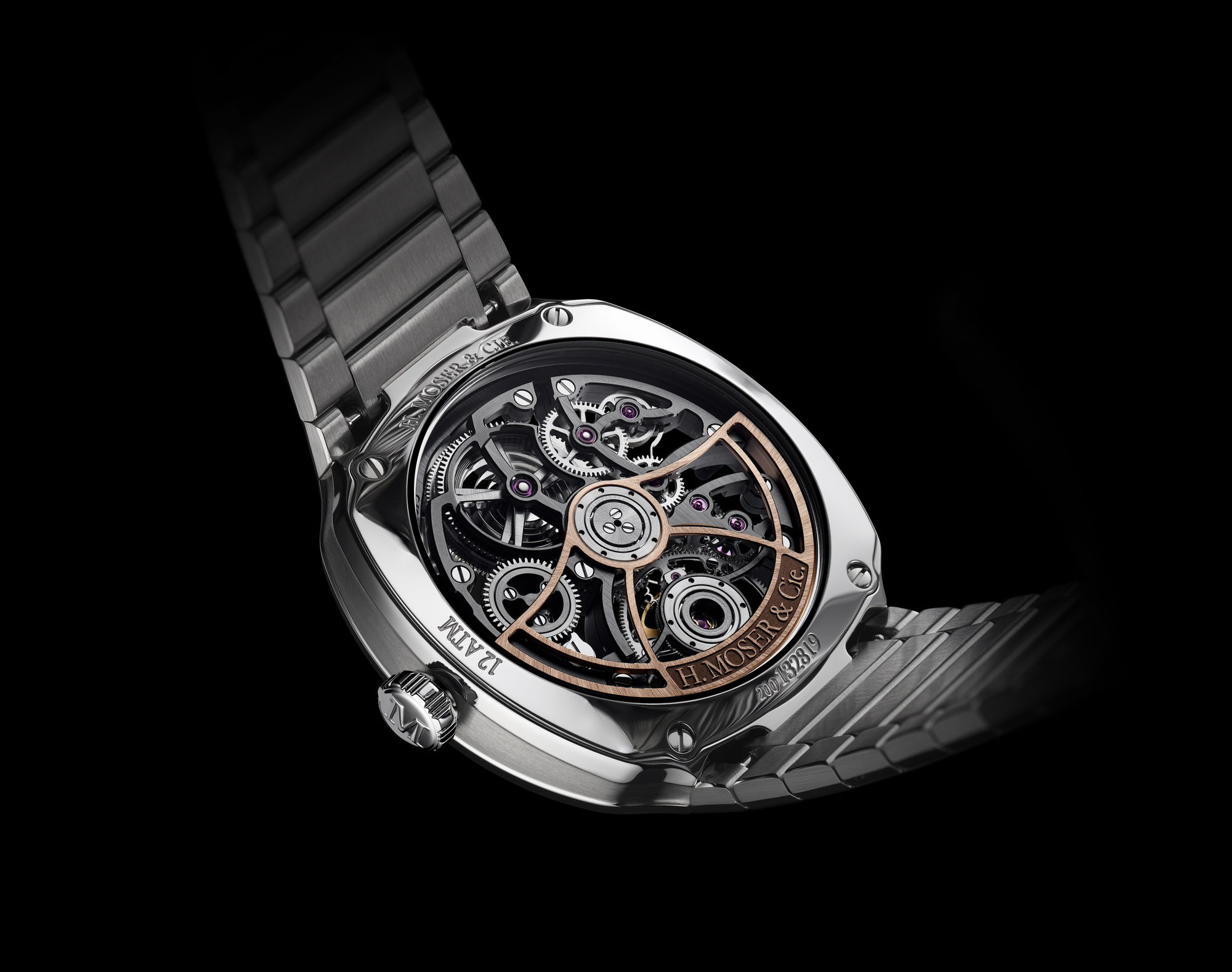 H. Moser & Cie. introduces the Streamliner Tourbillon Skeleton, a timepiece that epitomizes the brand’s dedication to combining visual charm with mechanical know-how. Stripping away excess material, the watch embraces a minimalist aesthetic, showcasing the intricate inner workings with transparency and symmetry. At its core lies a one-minute flying tourbillon, its double hairspring seemingly weightless amidst the exposed mechanism. Following the success of their Pioneer Cylindrical Tourbillon Skeleton, H. Moser & Cie. extends their skeleton watch offerings with this Streamliner model, continuing their exploration of the genre’s codes. The skeletonization process reveals a luminous piece, with every component sculpted to enhance transparency and depth. The ergonomic 40.0-mm steel cushion case, water-resistant to 12 ATM, seamlessly integrates with a steel bracelet, ensuring comfort and continuity of design. The Streamliner Tourbillon Skeleton’s movement, the automatic HMC 814, features a double hairspring engineered by Precision Engineering AG, sister company of H. Moser & Cie., improving accuracy and isochronism.