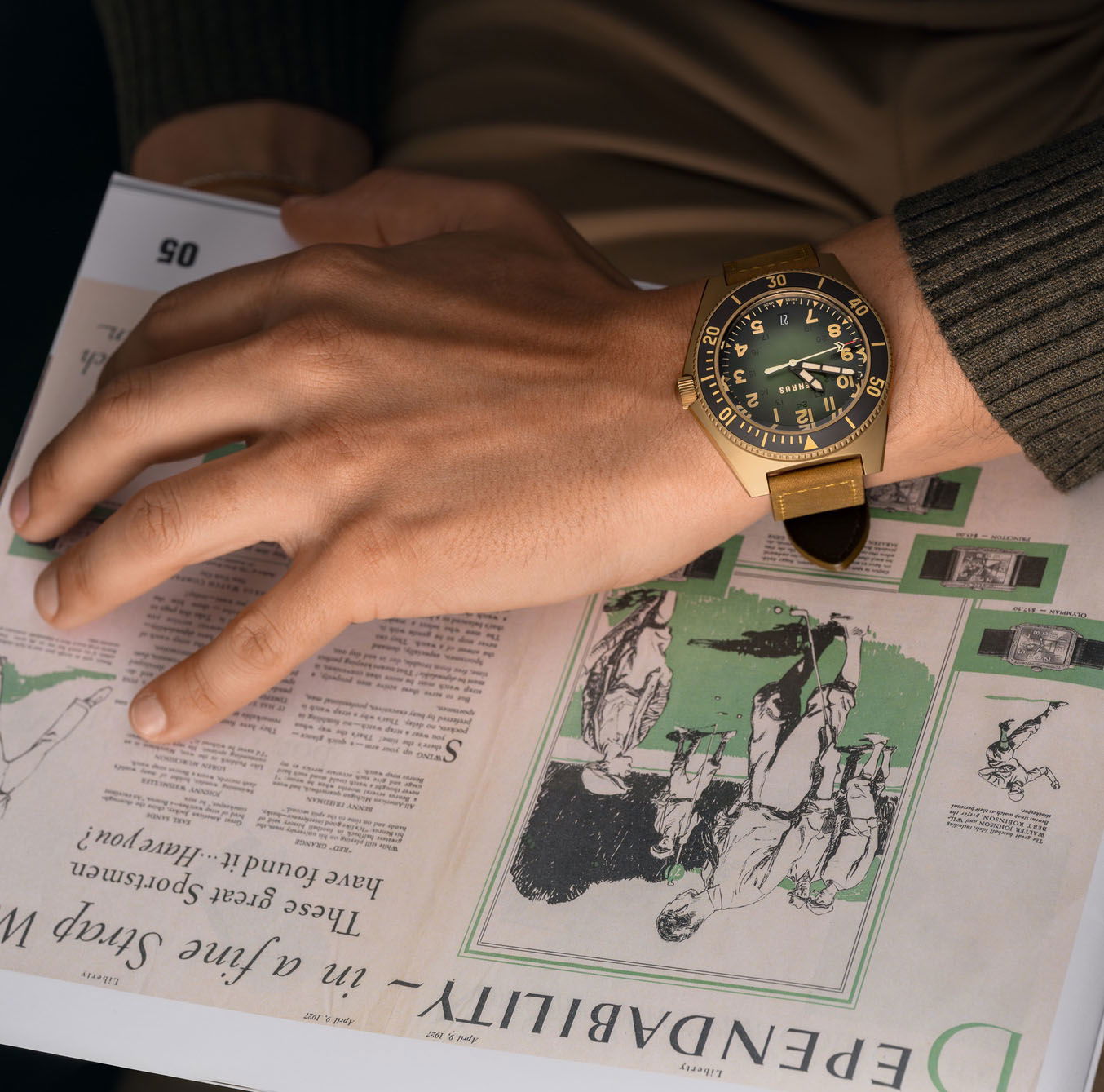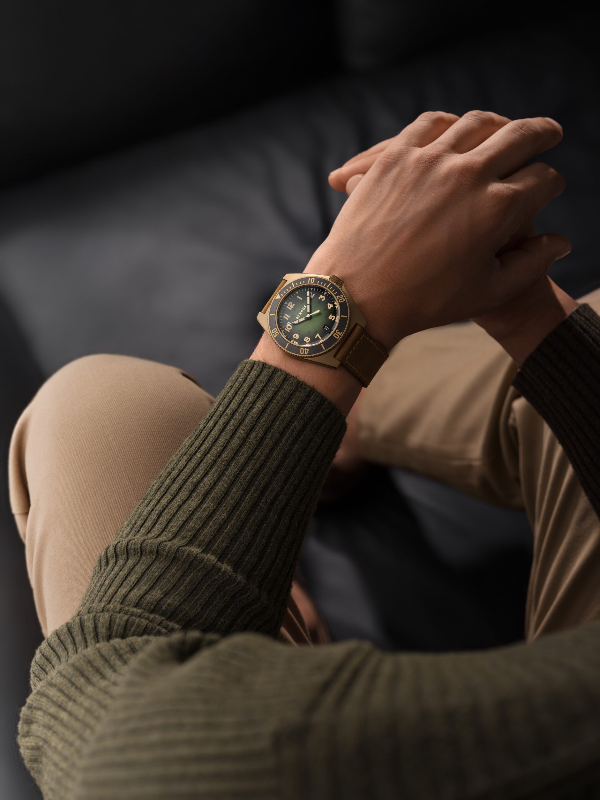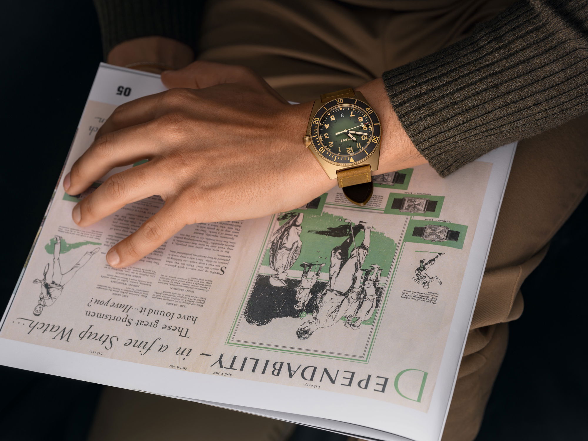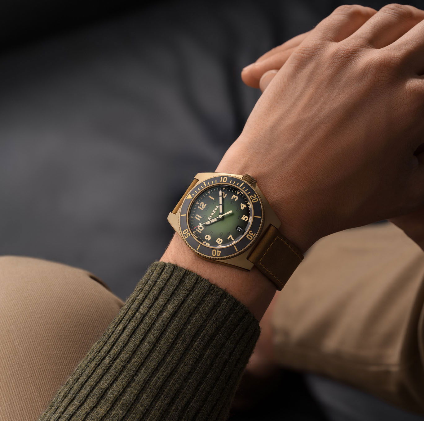The BENRUS Type 2 UJ carries the DNA of one of the most purpose-built military watches ever issued. In the 1960s, BENRUS became a trusted supplier to the U.S. armed forces, its watches seeing service from the jungles of Vietnam to the depths navigated by Navy SEALs, UDT divers, Army Rangers, Green Berets, and CIA operatives. By the early ’70s, the Pentagon realized these specialists needed something tougher and more versatile. Under Mil-Spec MIL-W-50717, BENRUS delivered the Type I, a pure dive watch, and the Type II, which added 12/24-hour legibility for fast mission timing in the field. The modern Type 2 UJ stays true to that no-nonsense ethos but with modern refinements. Its 41.5mm sandblasted 316L stainless steel case, finished in bronze PVD, feels rugged yet understated. A double-domed sapphire crystal with anti-reflective coating nods to vintage military style while improving clarity. BW G9 Super-LumiNova ensures visibility in low light, and the uni-directional bezel combines brushed bronze PVD with a ceramic inner ring for durability. Powering it is the Swiss ETA 2892, a slim, reliable caliber with a 42-hour reserve. Flip it over and the sapphire case back offers a view of the movement, a luxury absent from the original Mil-Spec. With 20 ATM water resistance and a supple brown leather strap, it’s assembled in La Chaux-de-Fonds, Switzerland. The Type 2 UJ proves a hard-use military watch can evolve with grace without losing its edge.