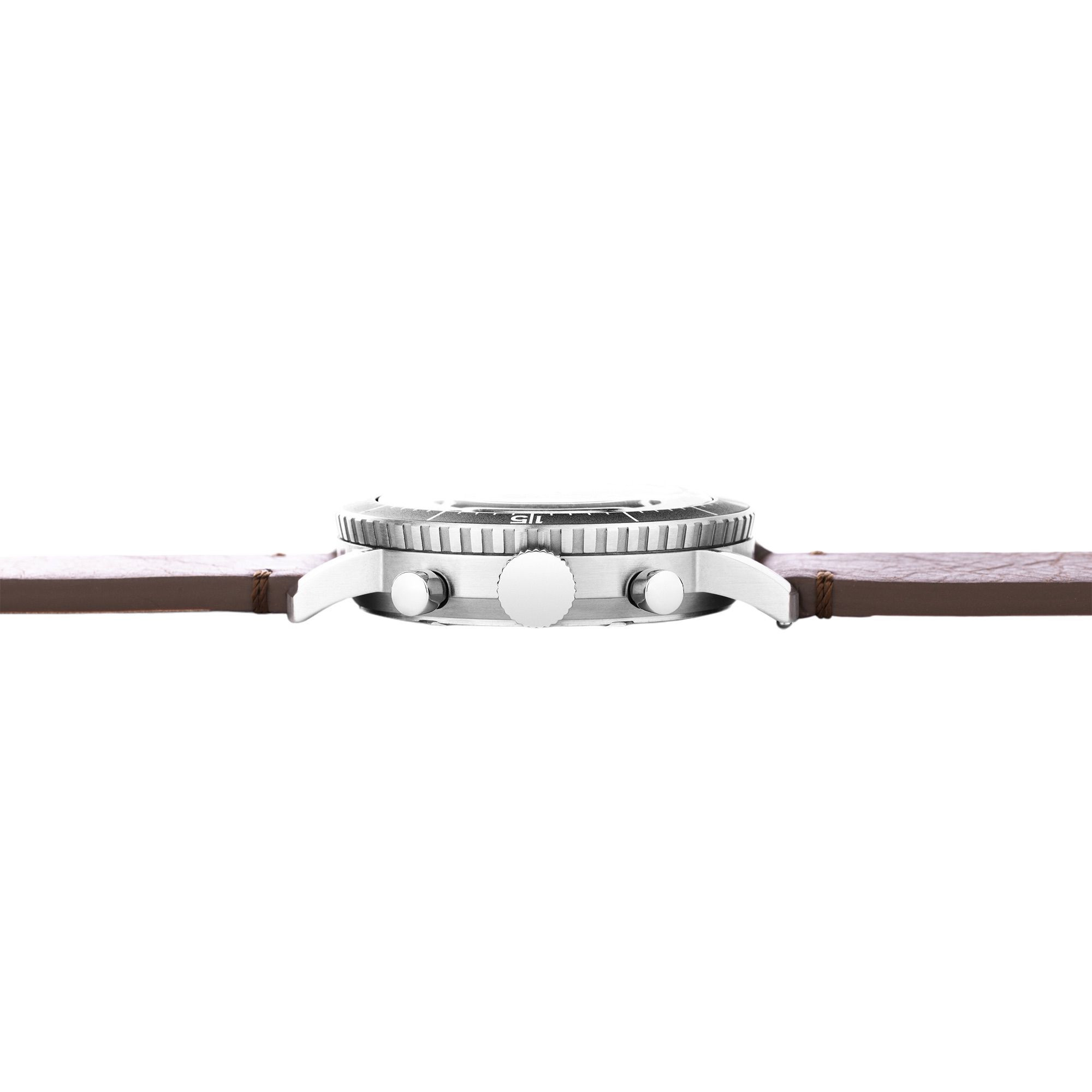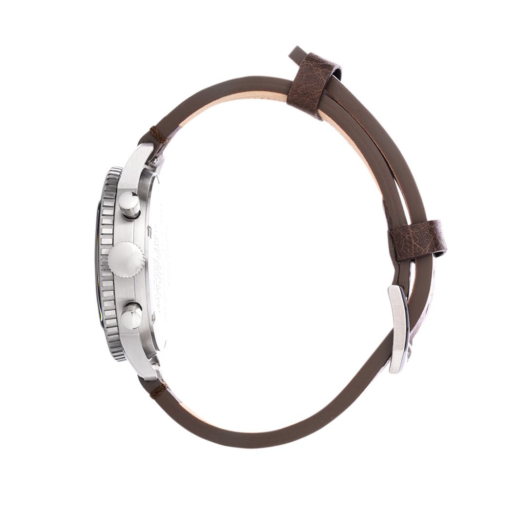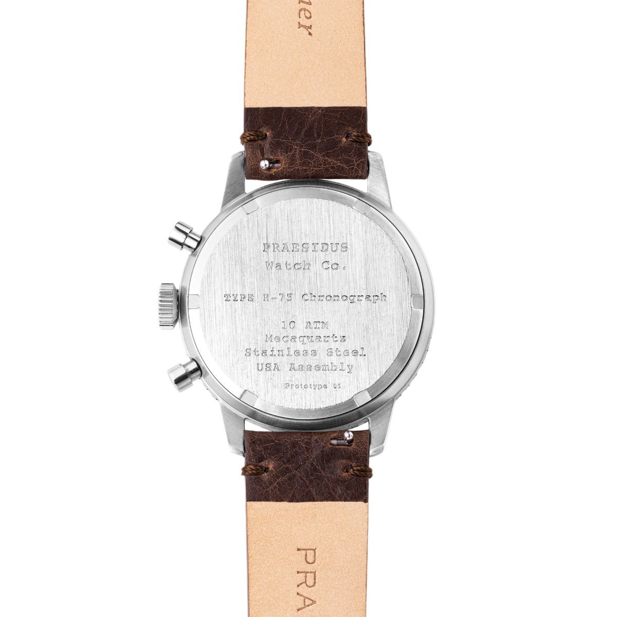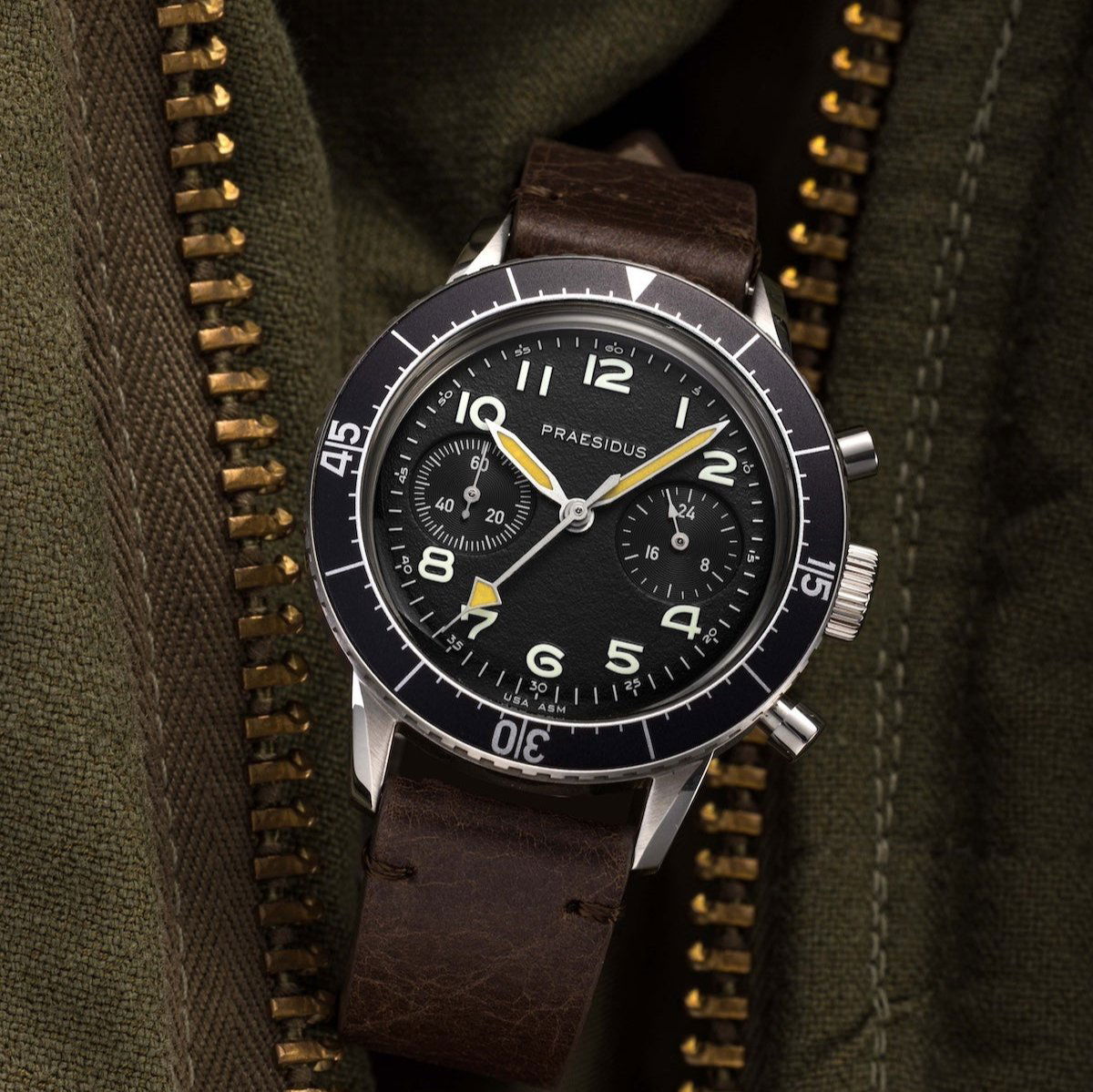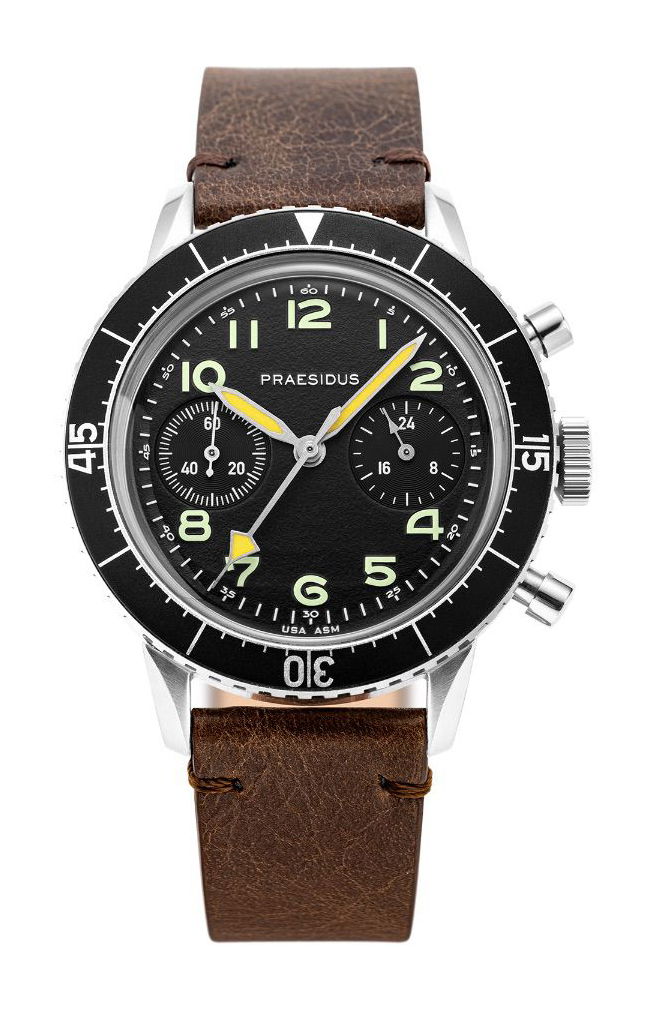Originally created in the 1970s for Italian helicopter pilots, the Type H-75 Chronograph is a rugged and reliable tool watch designed for precision and usability in any environment. The modern version updates the original with 10ATM water resistance and a meca-quartz chronograph movement, blending the golden age of military timepieces with performance. The oversized “arrow” and bold hour markers of the Type H-75 Chronograph ensure clear visibility in all conditions, making it an essential piece for demanding field operations. Over-sized chronograph pushers and a notched bezel were specifically designed for easy use, even with aviation or field gloves, providing seamless functionality during critical moments. The luminous display ensures exceptional readability from day to night. The Praesidus Type H-75 feels like a genuine nod to history, made for those who appreciate a good story as much as a well-built watch.