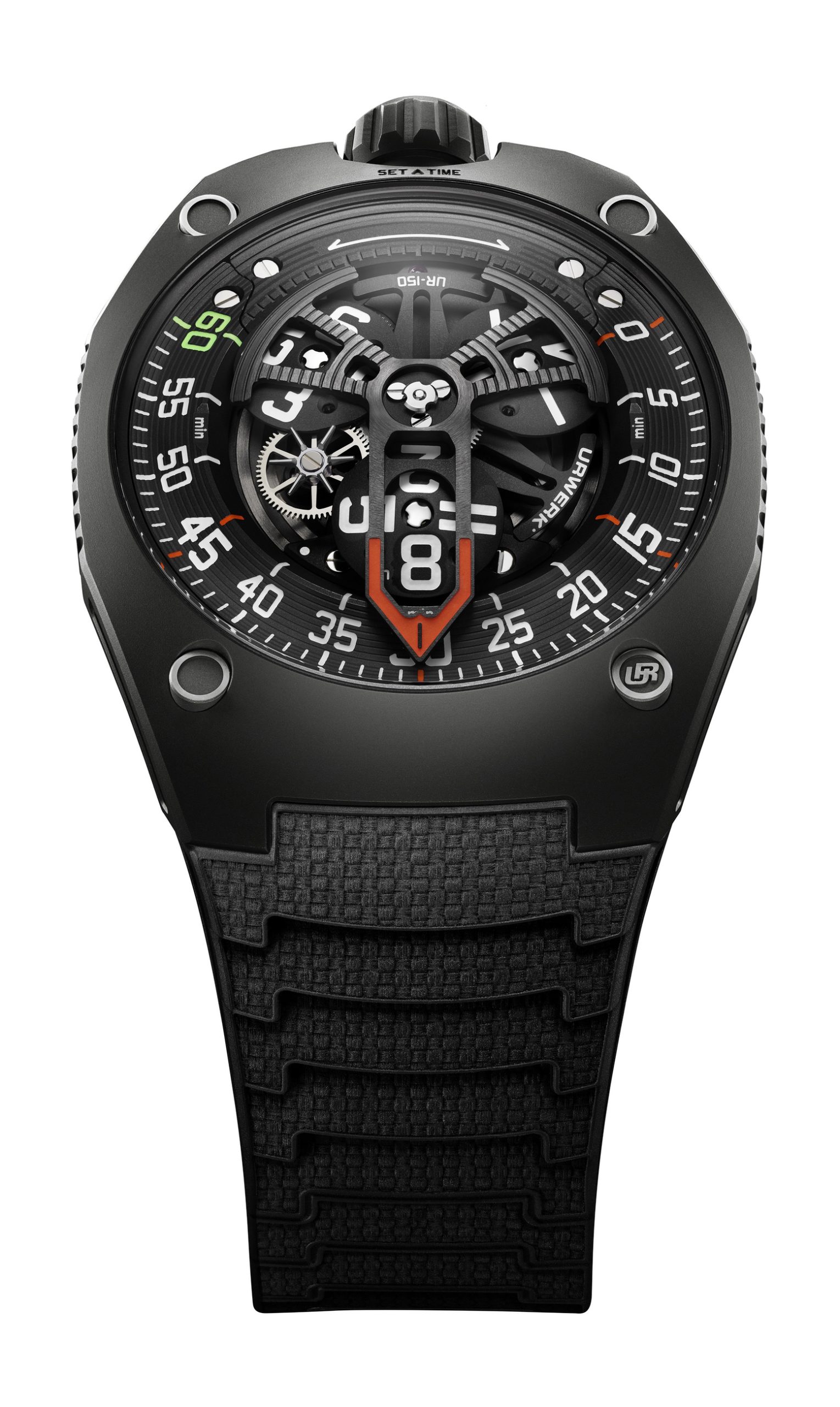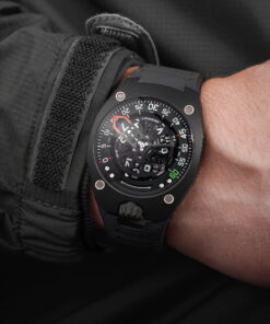 URWERK has redesigned its iconic satellite hours complication with the UR-150 Scorpion, a watch with a rounded exterior that hides a powerful mechanism. The watch’s design is inspired by the scorpion’s stinger, symbolized by the trajectory of the 240-degree minutes hand, which strikes fast and aggressively when it reaches the hour mark. Despite its menacing inspiration, the design retains URWERK’s characteristic calm and refined appearance, according to Felix Baumgartner, co-founder of the brand. The mechanism of the Urwerk UR-150 Scorpion features an innovative retrograde hand that frames the hour, and at the end of every hour, it resets in just 1/100th of a second. The complex system of satellites and satellite complication rely on a cam mechanism, replacing the traditional Maltese cross-system, and is visible in the larger gap between the 60 and 0-minute markers. This setup creates a ‘Perfect Storm’ of mechanics that optimizes energy efficiency and maintains accuracy, with the minutes hand traveling across a 240-degree arc. The automatic winding system is also advanced, equipped with turbines that absorb shocks, protecting the mechanism. design combines sharp angles with smooth curves, ensuring ergonomic comfort as it follows the shape of the wrist. URWERK’s creative director, Martin Frei, explains the balance of tension in the design, emphasizing that the watch’s vitality comes from this dynamic interaction between curves and sharp mechanics. Finally, the Urwerk UR-150 Scorpion is available in two versions: Titan and Dark, with a limited production of 50 pieces each.