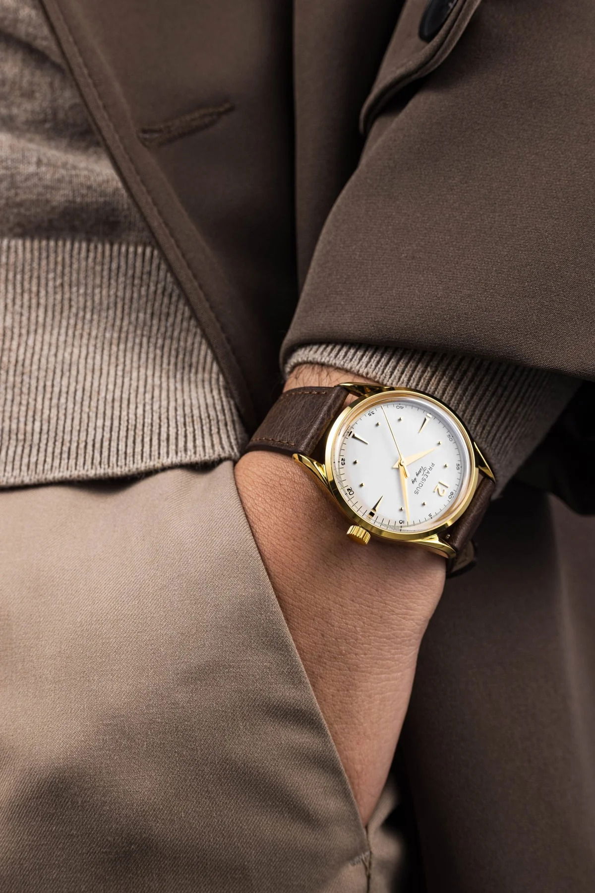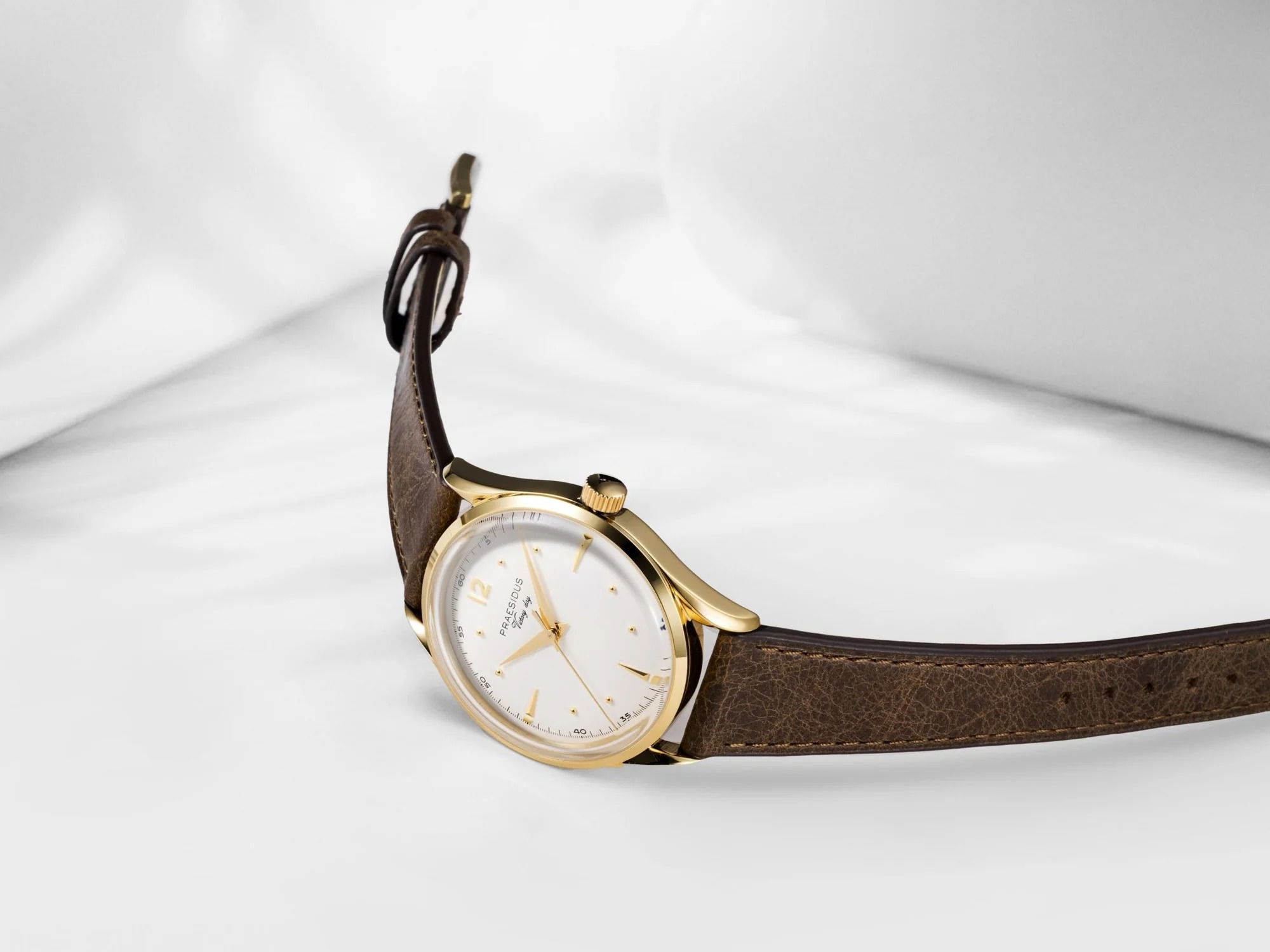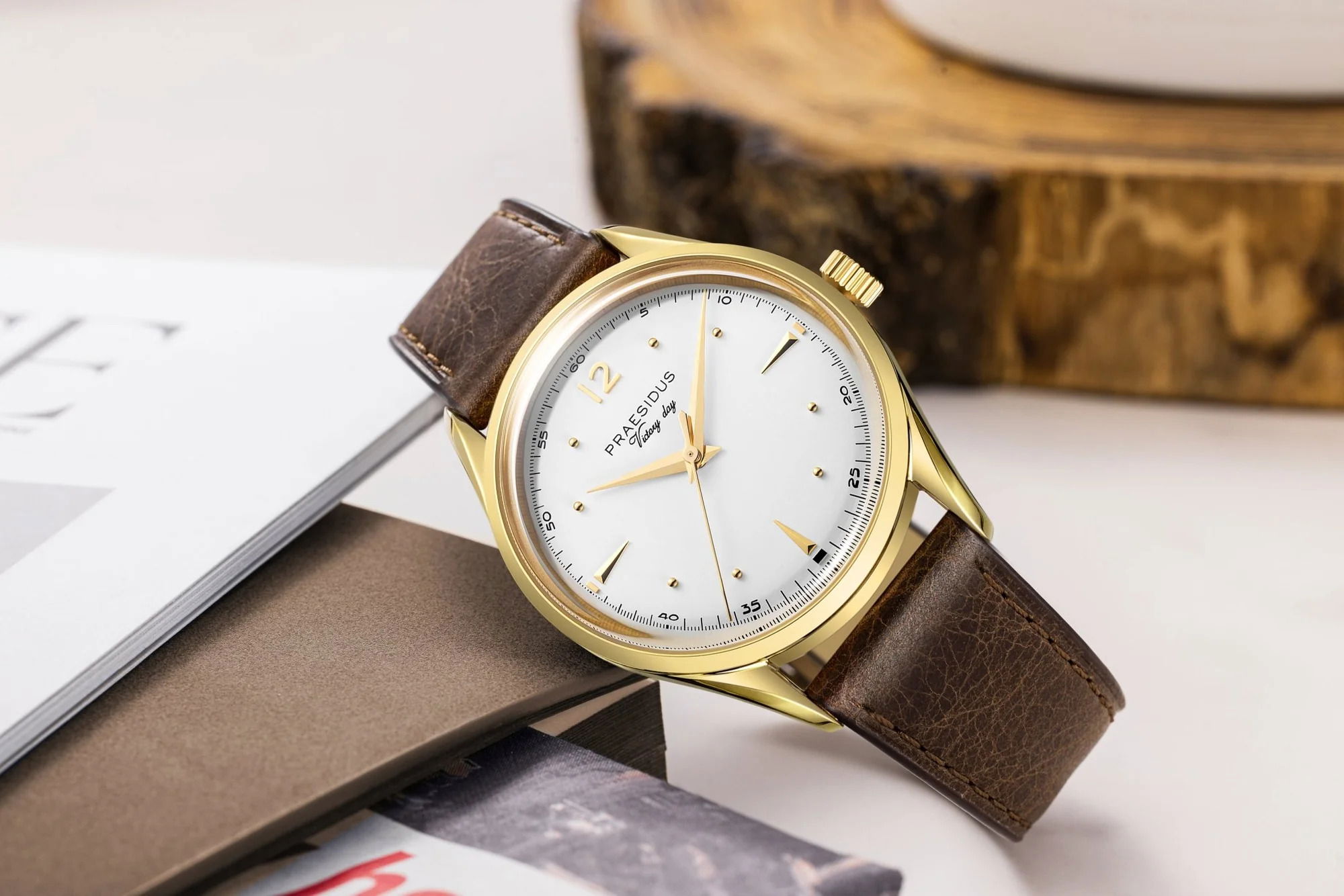 There is a certain poetry in the dress watches that emerged after 1945. No longer instruments of survival, they became companions for renewal – slender, elegant markers of weddings, promotions, and dinners with family. In that spirit, Praesidus Watch Co. has turned its attention from the battlefield to the ballroom with the release of its first dress watch: the Victory. Timed to the 80th anniversary of V-Day, the watch is a natural progression of the brand’s mission to commemorate history while shaping what comes next. The Victory arrives in four distinct guises, White Dove, Champagne, Silverline, and Classic, available in either stainless steel or yellow gold-plated steel. At 38 mm, the case strikes a balanced note between period authenticity and modern wearability, topped with sapphire crystal for everyday resilience. Inside beats the Miyota 9039, a reliable automatic movement chosen for its slim profile, while leather straps reinforce its understated elegance. Water resistance to 100 meters ensures the Victory is more than a delicate ornament.