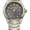 Women’s EBEL Wave watch, 30 mm stainless steel case with 18K yellow gold bezel and crown, white mother-of-pearl dial with 8 diamond markers (0.052 t.c.w.) and applied EBEL symbol and indexes, brushed and polished two-toned stainless steel signature wave-link bracelet with deployment clasp.