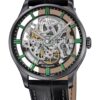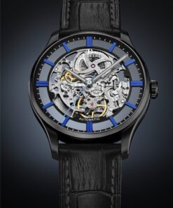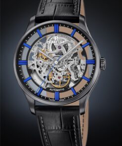 For the 2024 winter season, Perrelet has introduced a new model in their collection of men’s dress watches: the WEEKEND SKELETON. This piece features a skeletonized movement, a first for this line. The watch retains key features, such as a 39.5mm steel case with a thin profile (9.61mm) and water resistance up to 5 ATM. The polished and brushed steel case now sports a matt black PVD coating, enhancing the appeal of the skeleton movement visible through the anti-reflective sapphire crystal. The movement at the heart of the WEEKEND SKELETON is the newly developed in-house P-351-SQ automatic calibre. It’s a slim (3.6mm) skeleton movement, beating at a high frequency of 28,800 vibrations per hour with a 42-hour power reserve. The movement is displayed on both the front and back of the watch, thanks to a transparent case back secured by four screws. The dial is minimalistic, with skeletonized elements forming the primary design focus. The baton hour markers and central seconds hand come in three color variations: black, electric blue, and emerald green. Rhodium-plated hands, filled with white Super-LumiNova®, ensure legibility in all lighting conditions.