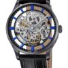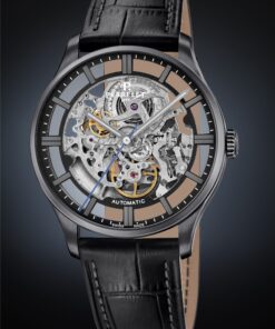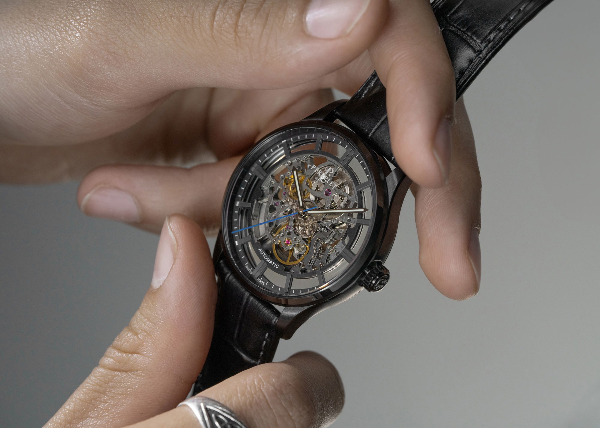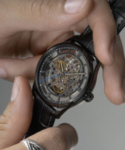 For the 2024 winter season, Perrelet has introduced a new model in their collection of men’s dress watches: the WEEKEND SKELETON. This piece features a skeletonized movement, a first for this line. The watch retains key features, such as a 39.5mm steel case with a thin profile (9.61mm) and water resistance up to 5 ATM. The polished and brushed steel case now sports a matt black PVD coating, enhancing the appeal of the skeleton movement visible through the anti-reflective sapphire crystal. The movement at the heart of the WEEKEND SKELETON is the newly developed in-house P-351-SQ automatic calibre. It’s a slim (3.6mm) skeleton movement, beating at a high frequency of 28,800 vibrations per hour with a 42-hour power reserve. The movement is displayed on both the front and back of the watch, thanks to a transparent case back secured by four screws. The dial is minimalistic, with skeletonized elements forming the primary design focus. The baton hour markers and central seconds hand come in three color variations: black, electric blue, and emerald green. Rhodium-plated hands, filled with white Super-LumiNova®, ensure legibility in all lighting conditions.